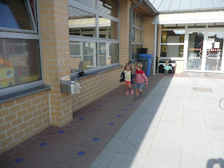 We oefenen enkele vaardigheden rond het verkeer. Samen op het voetpad stappen, goed kijken vooraleer we oversteken, ....