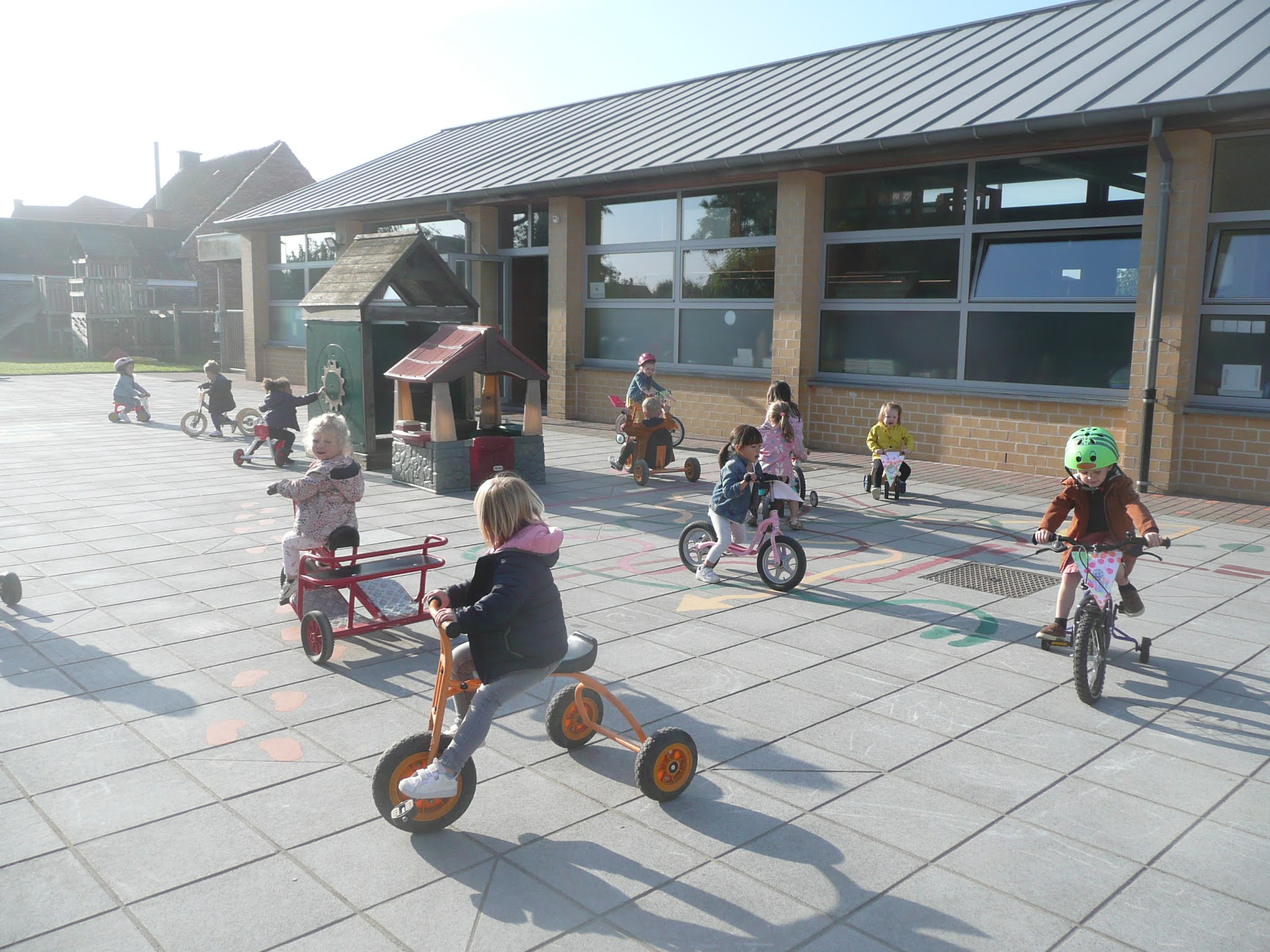 Bij groen licht mogen we fietsen, bij rood moeten we stoppen! Oh er worden werken uitgevoerd: we stappen van onze fiets en stappen met de fiets aan de handen.Onze fiets staat geparkeerd: we rijden rond en vinden onze eigen parkeerplaats terug.
